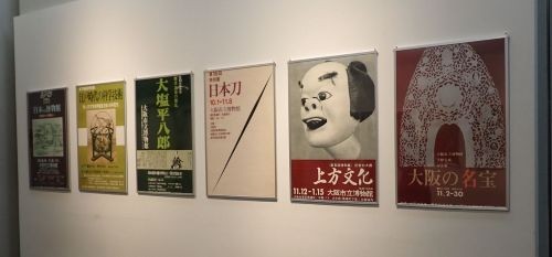 会場のなかほどにある休憩スペースの通路には、大阪歴史博物館の前身、大阪市立博物館の特別展のポスターがずらり。